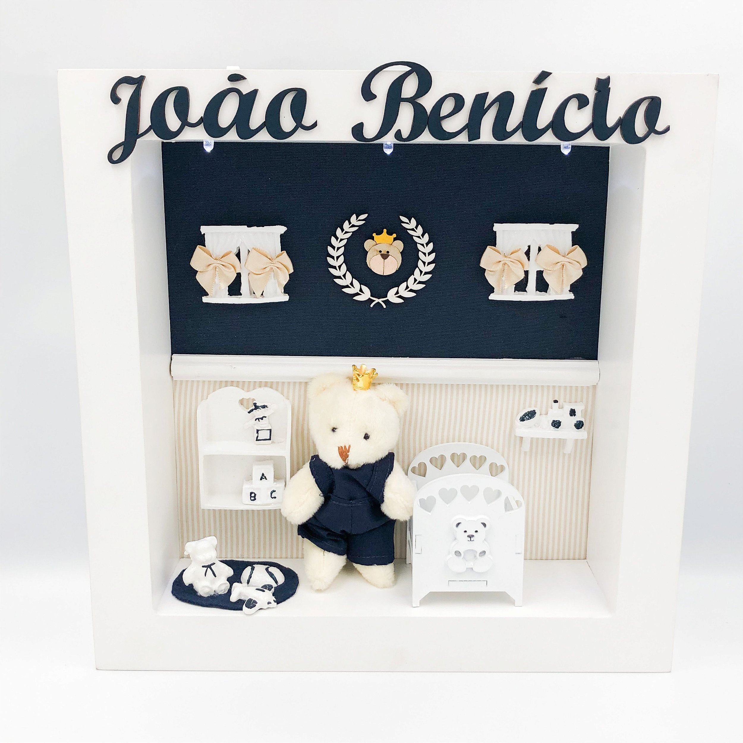 Colocamos o nome do bebê em qualquer um dos quadros e fazemos a decoração com cada detalhe escolhido, podendo colocar os familiares no quadro e até bichinhos de estimação.