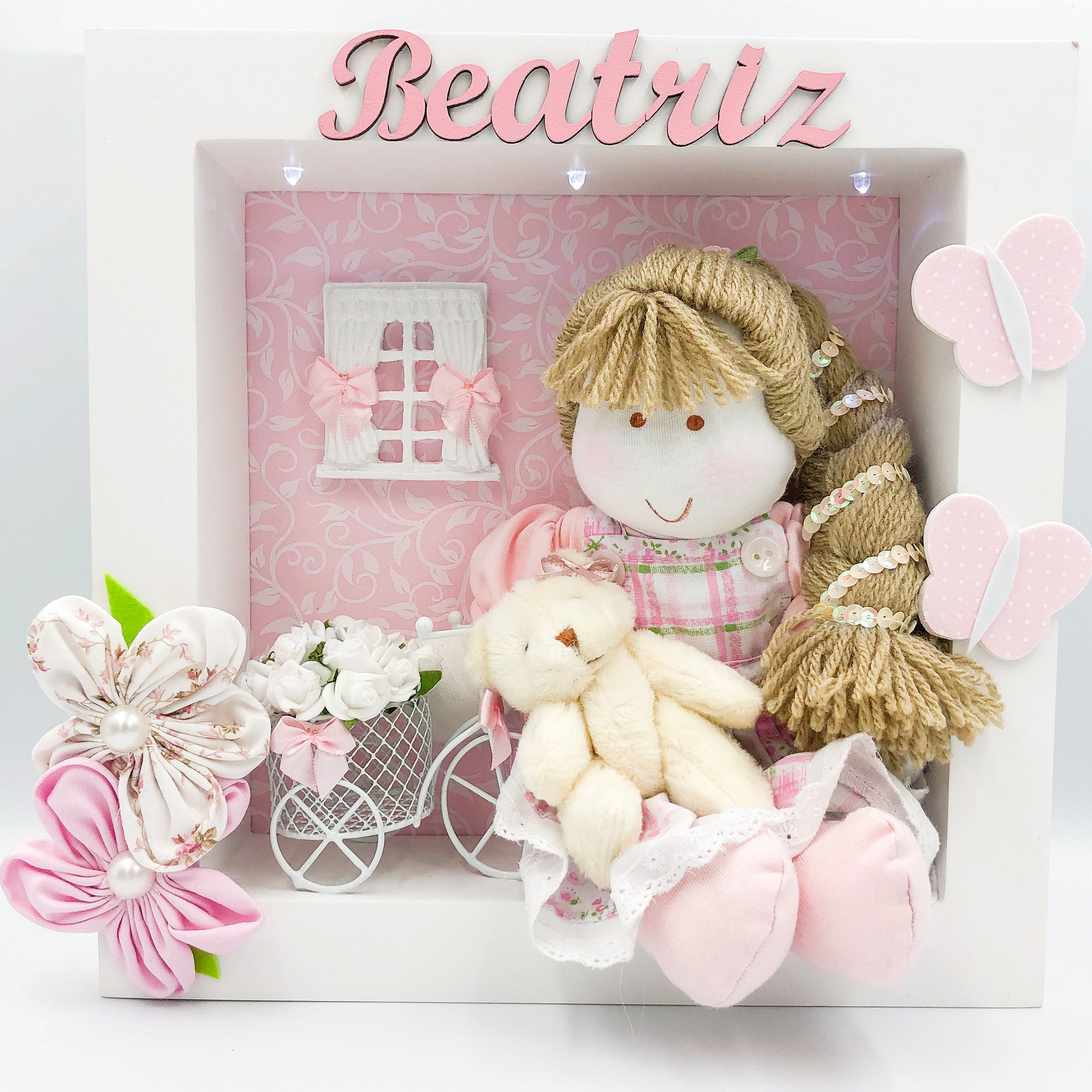 Colocamos o nome do bebê em qualquer um dos quadros e fazemos a decoração com cada detalhe escolhido, podendo colocar os familiares no quadro e até bichinhos de estimação.