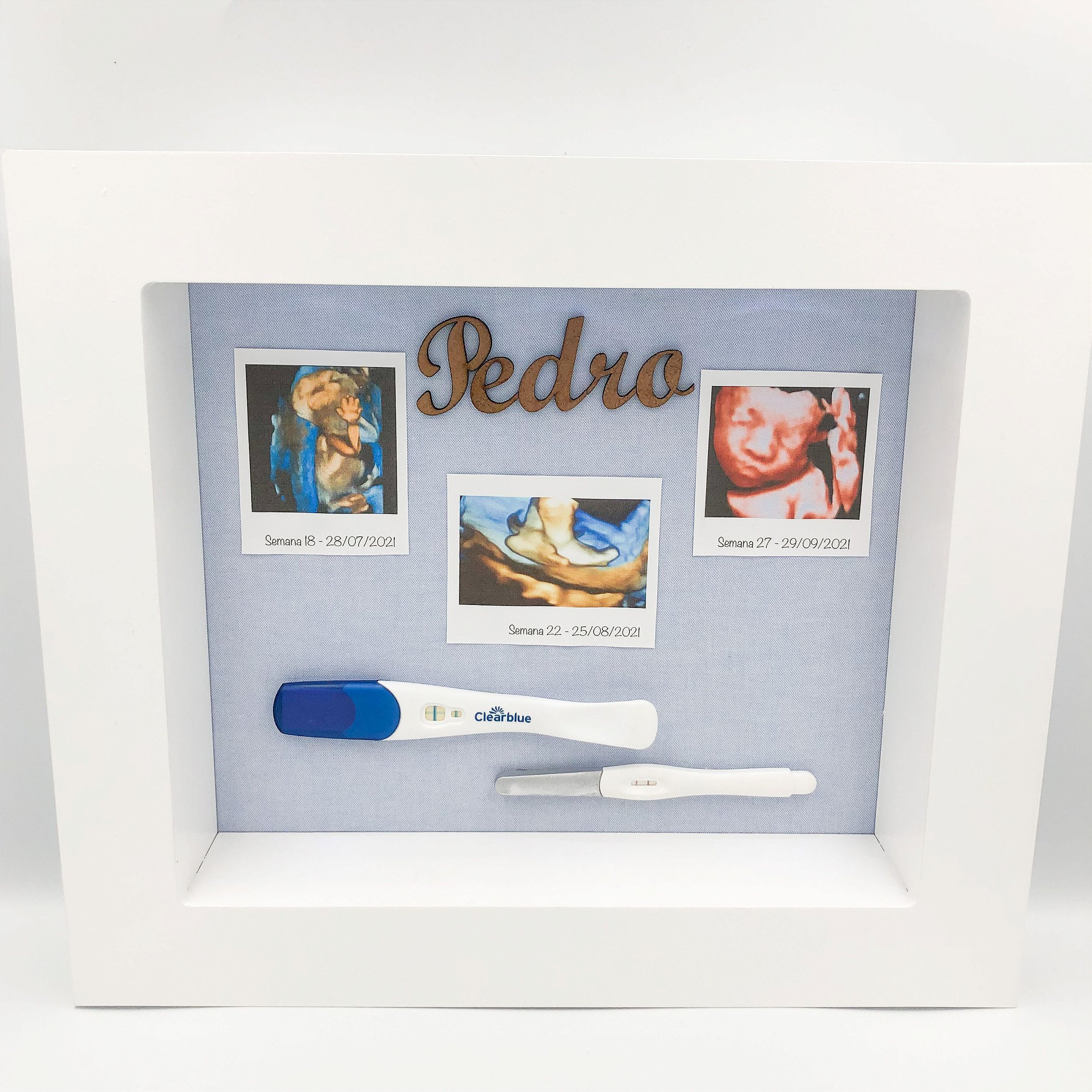 Colocamos o nome do bebê em qualquer um dos quadros e fazemos a decoração com cada detalhe escolhido, podendo colocar os familiares no quadro e até bichinhos de estimação.